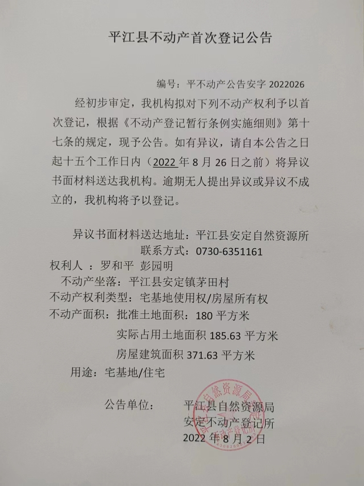 罗和平、彭园明首次登记公告