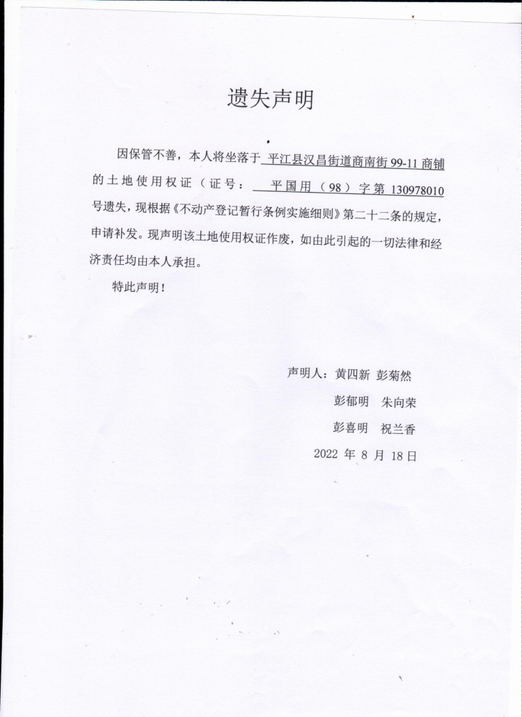 黄四新等六人土地证遗失声明