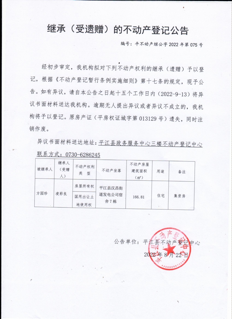 凌彩良继承(受遗赠)不动产登记公告