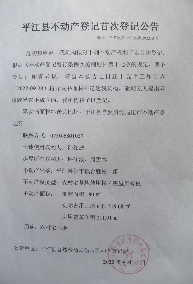 许红波 周雪春 平江县不动产登记首次登记公告