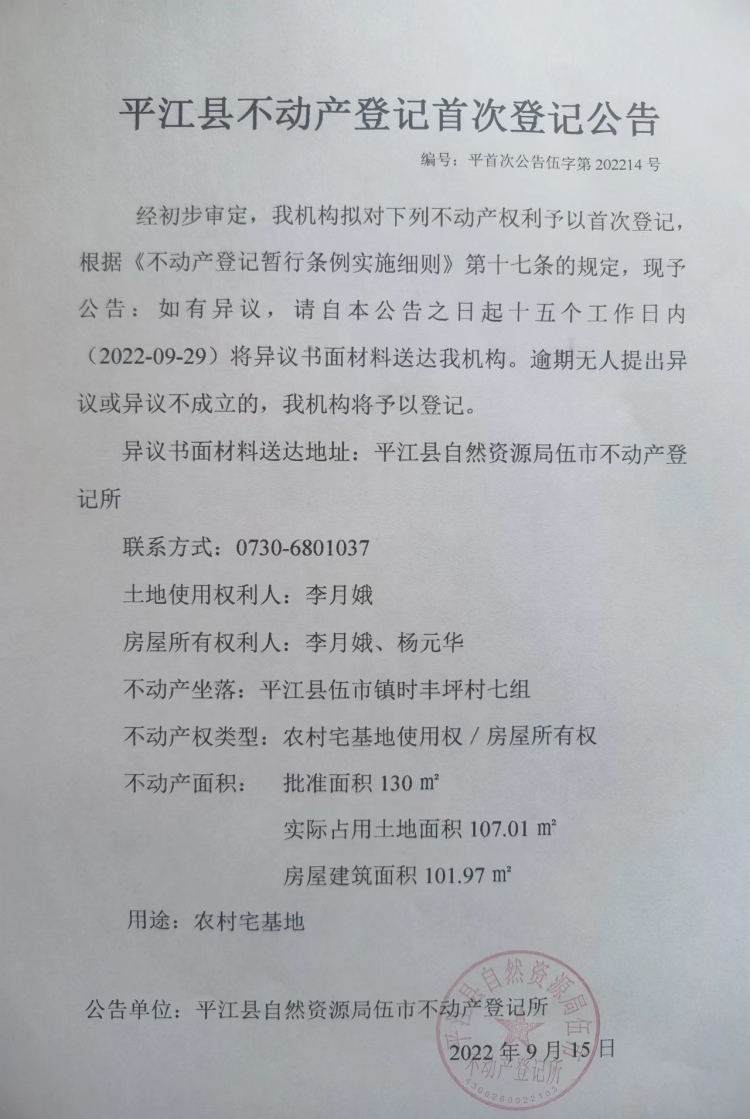 李月娥 杨元华 不动产登记首次登记公告