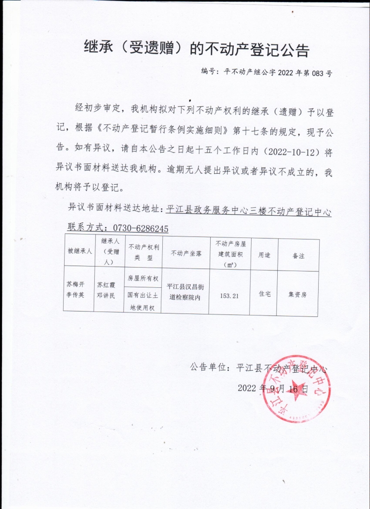 苏红霞、邓讲民继承(受遗赠)的不动产登记公告