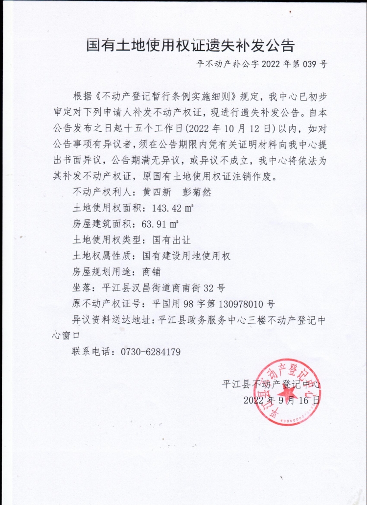 黄四新、彭菊然国有土地使用权证遗失补发公告