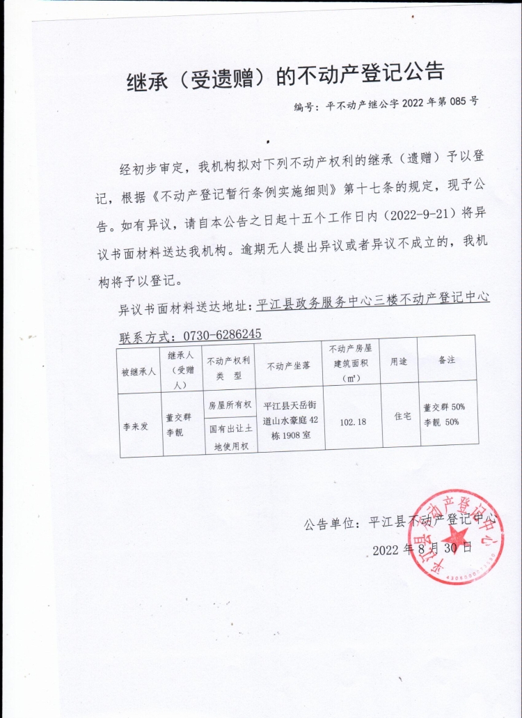 董交群、李靓继承(受遗赠)的不动产登记公告