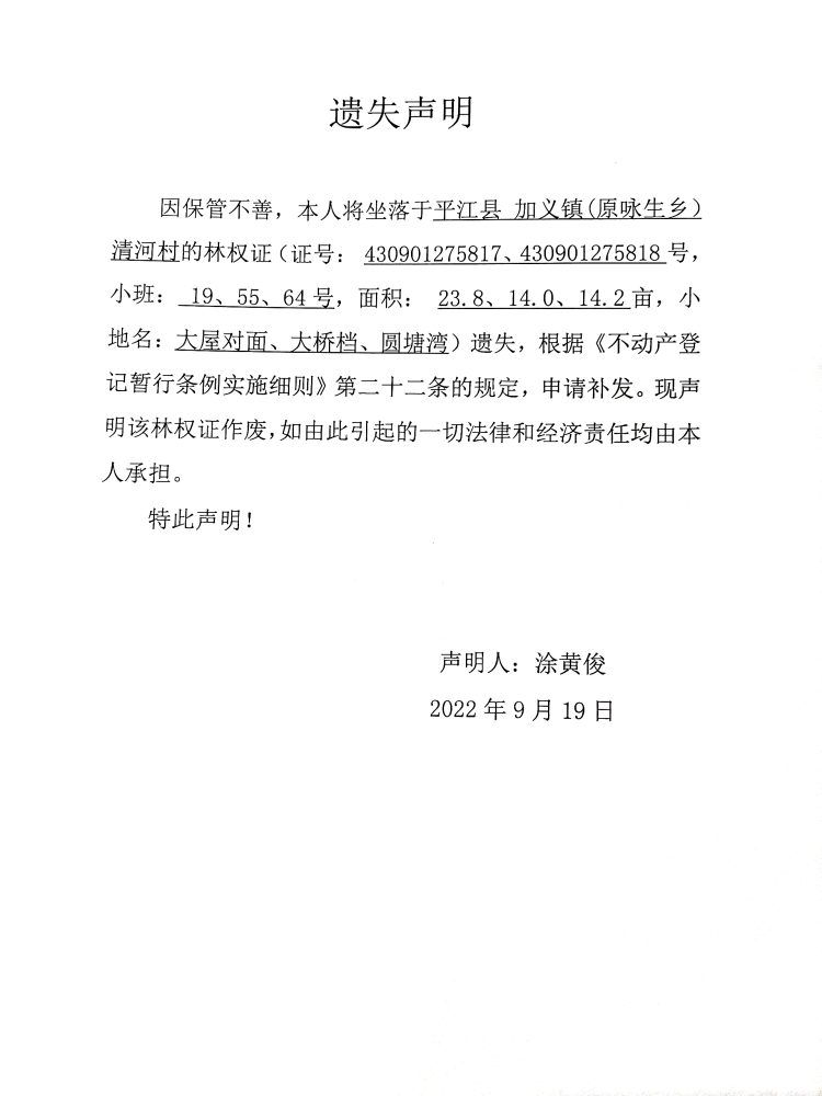 涂黄俊林权证遗失声明