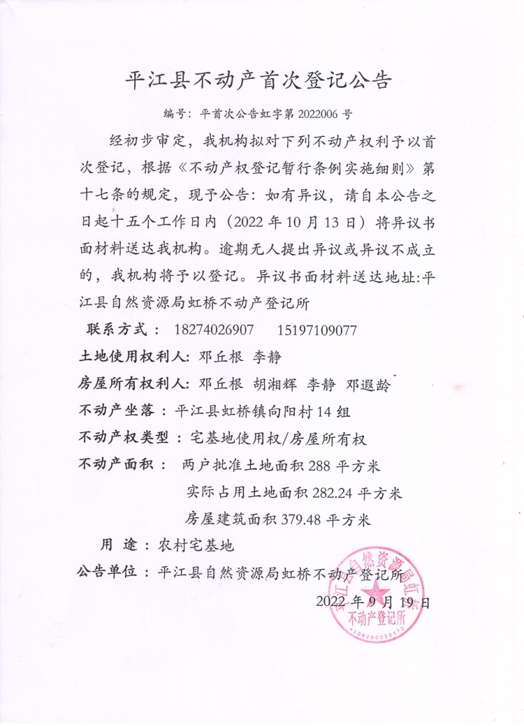 邓丘根 胡湘辉 李静 邓遐龄不动产首次登记公告