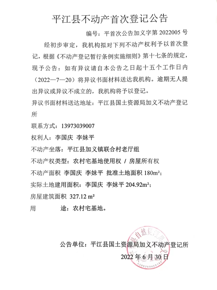 李国庆 李妹平不动产首次登记公告