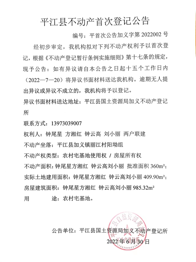 钟尾星 方湘红 钟云高 刘小丽 不动产首次登记公告