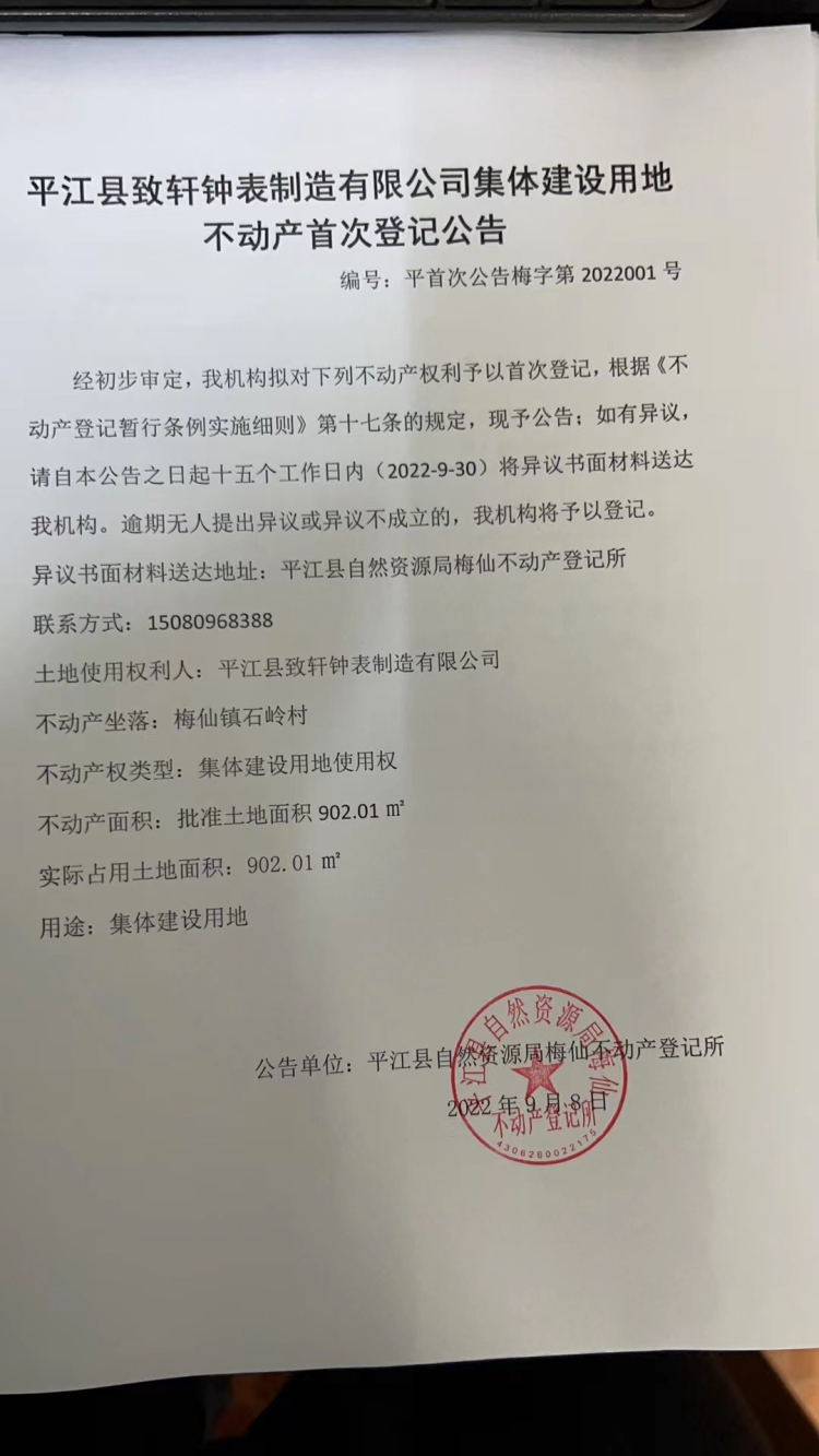 平江县致轩钟表制造有限公司集体建设用地不动产首次登记公告