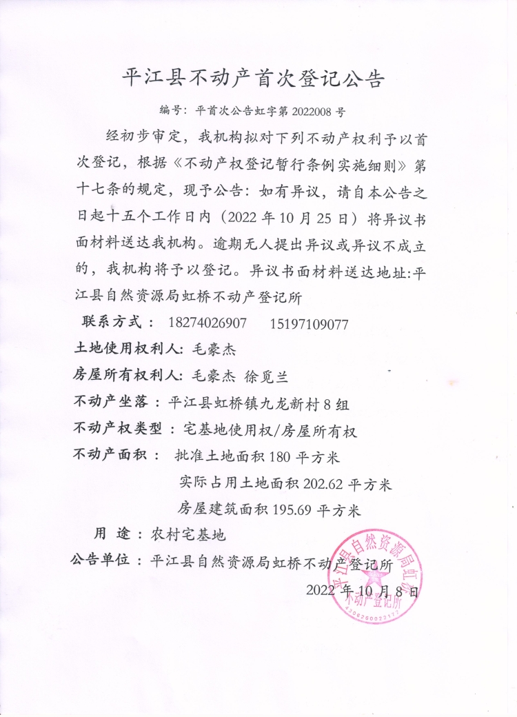 毛豪杰 徐觅兰不动产首次登记公告