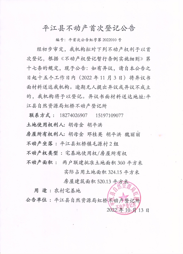 胡母金 邓桂英 胡平洪 魏丽丽不动产首次登记