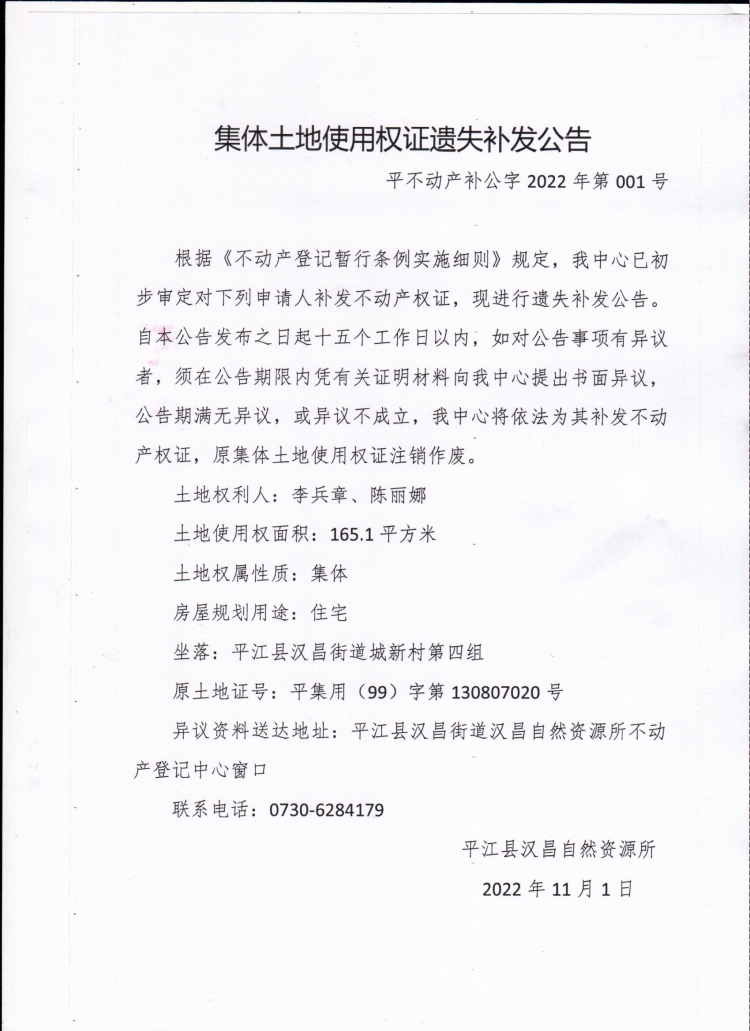 李兵章、陈丽娜集体土地使用权证遗失补发公告