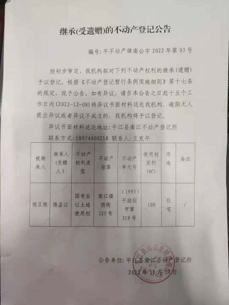 陈正根继承(受遗赠)的不动产登记公告