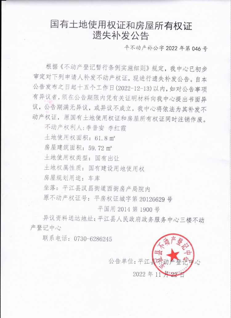 李普安 李红霞国有土地使用权证和房屋所有权证遗失补发公告