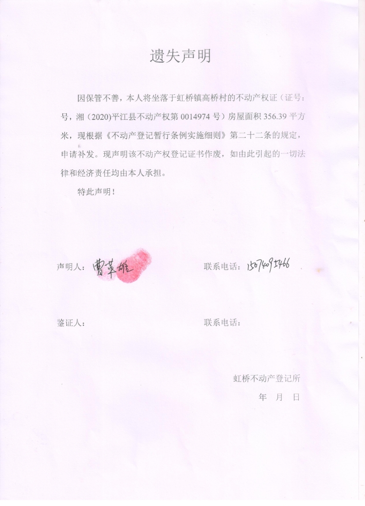 卢平娥 曹革雄不动产权证遗失补发公告