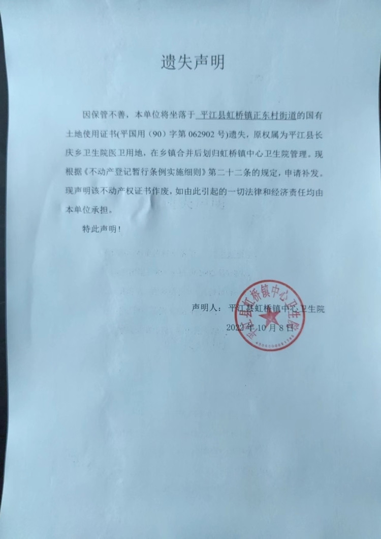 平江县虹桥镇中心卫生院土地证遗失声明