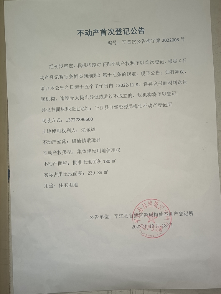 朱诚辉不动产首次登记公告