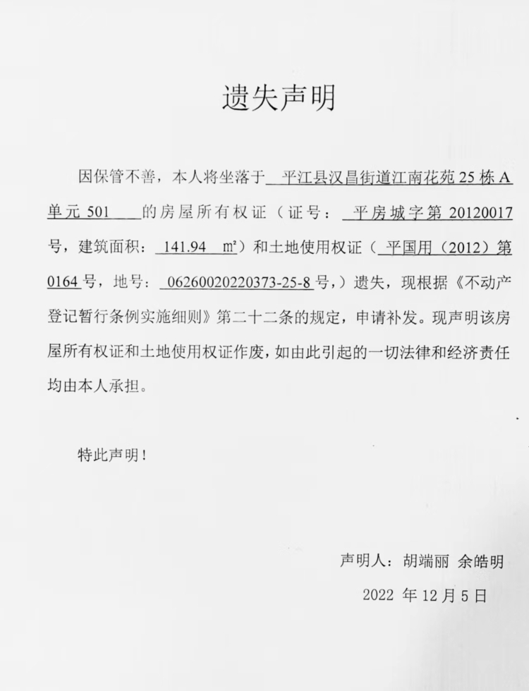 胡端丽 余皓明房屋土地所有权证遗失声明