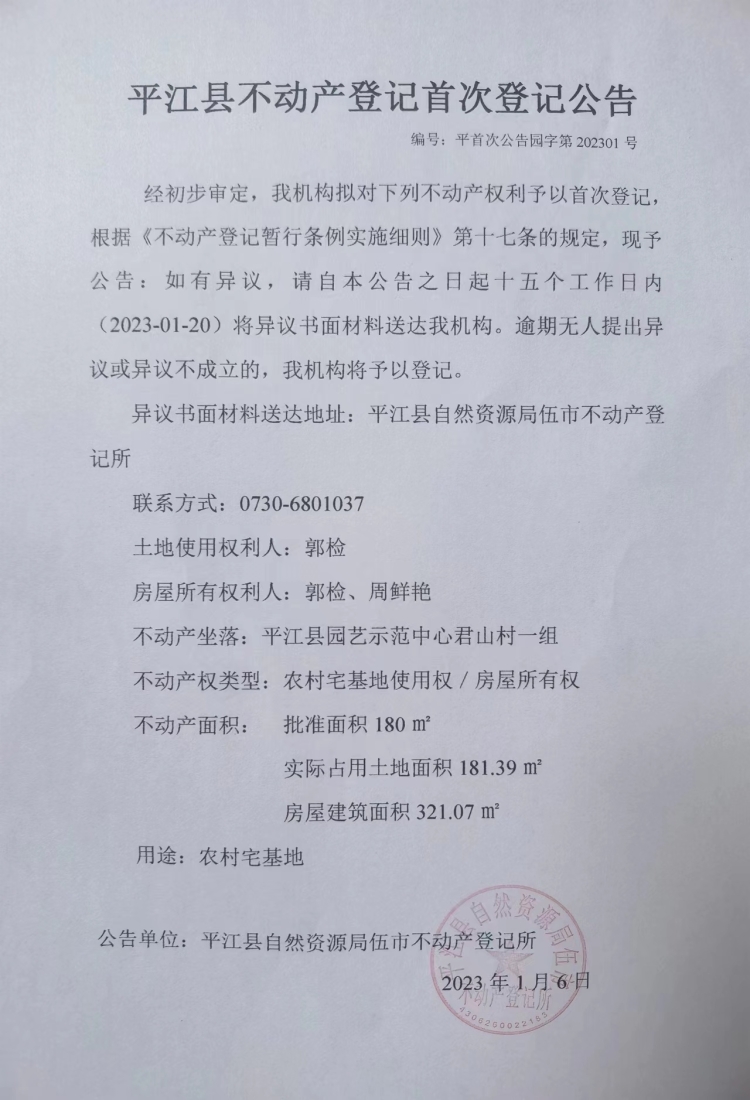 郭检 周鲜艳 平江县不动产登记首次登记公告