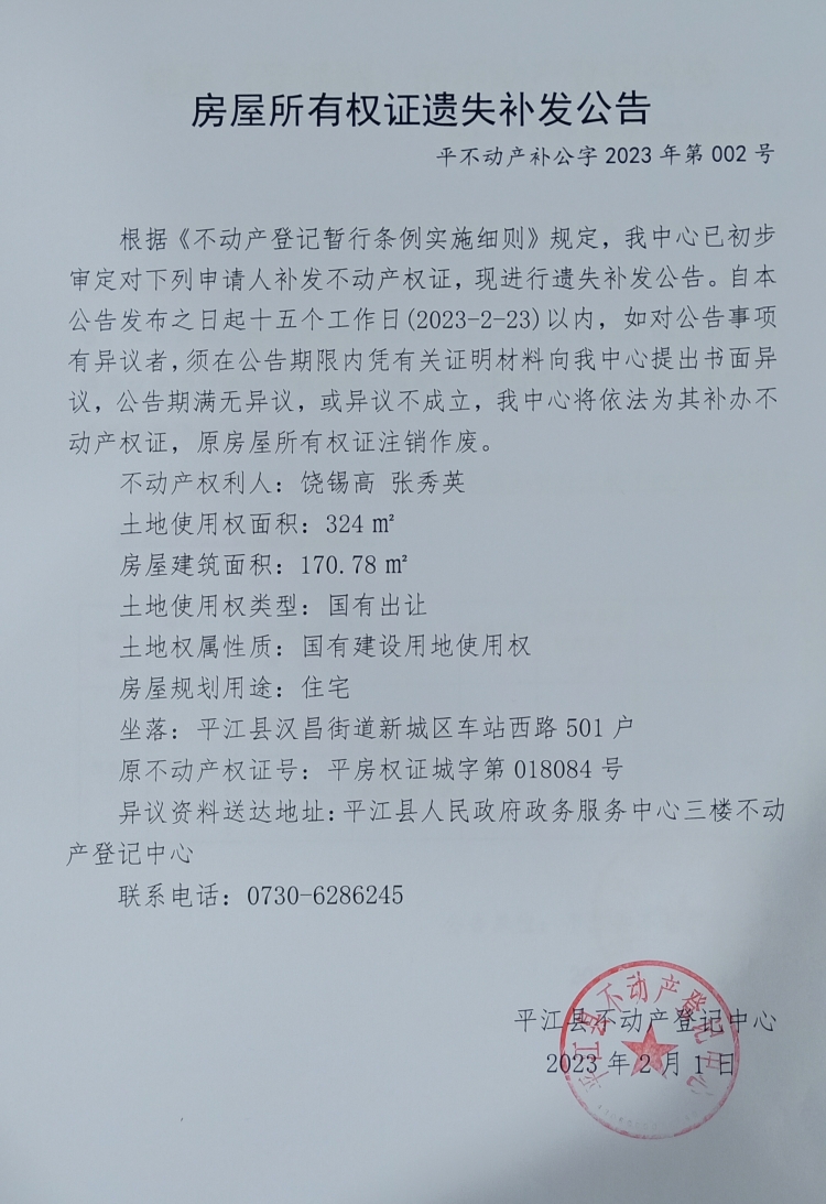 饶锡高 张秀英房屋所有权证遗失补发公告
