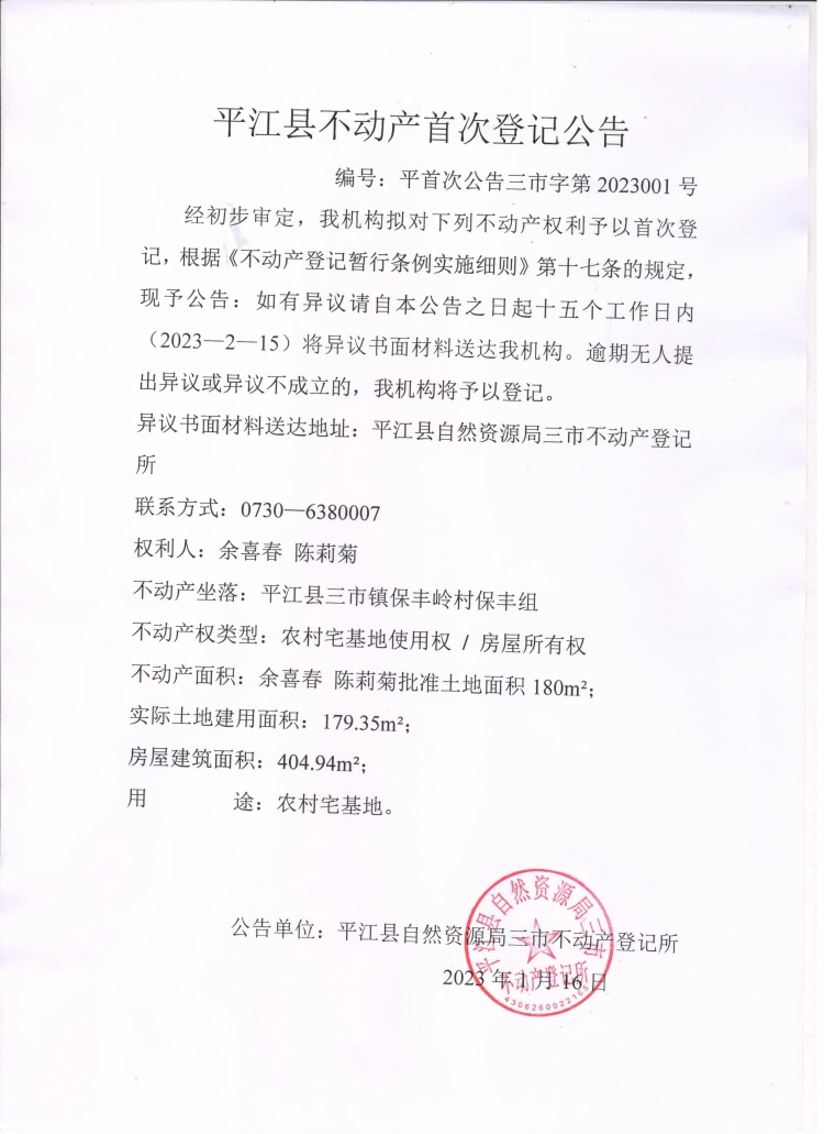 余喜春 陈莉菊不动产首次登记公告