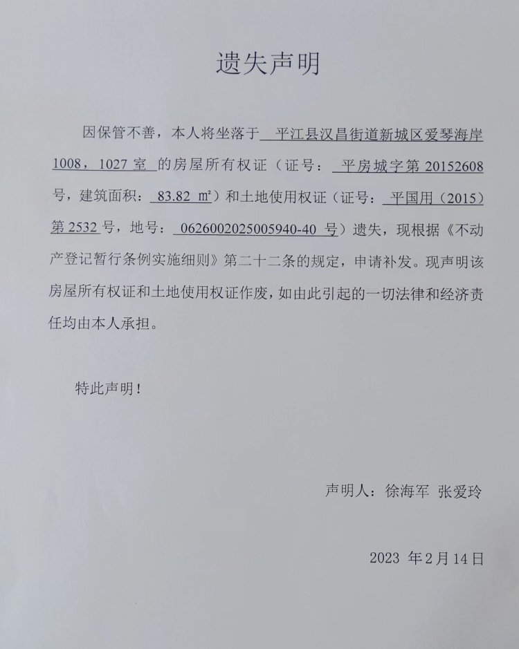徐海军 张爱玲房屋和土地所有权遗失声明