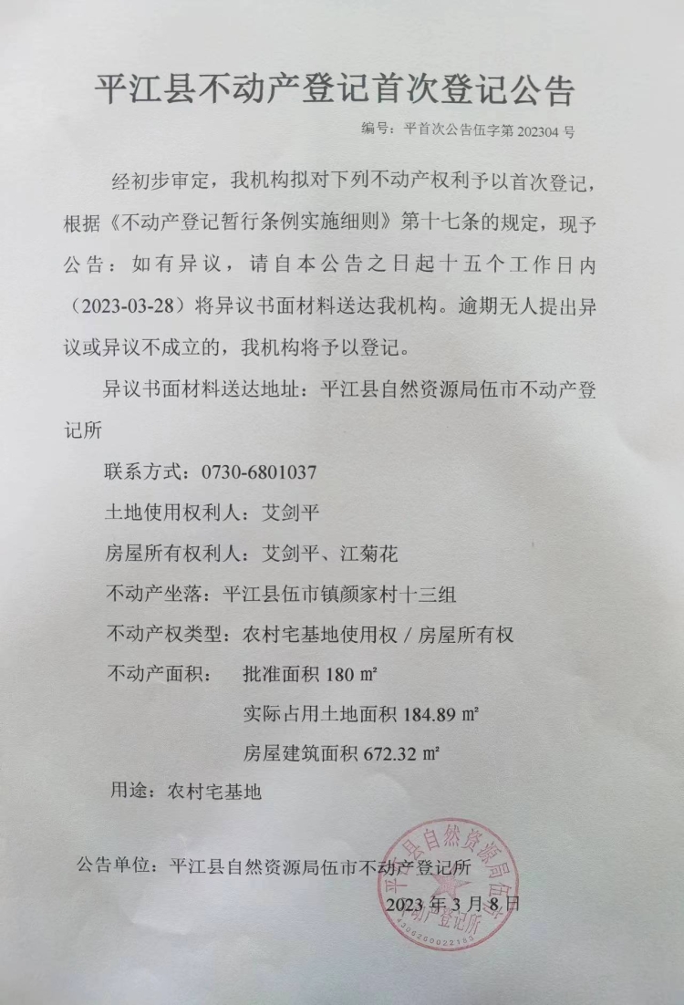 艾剑平 江菊花 平江县不动产登记首次登记公告