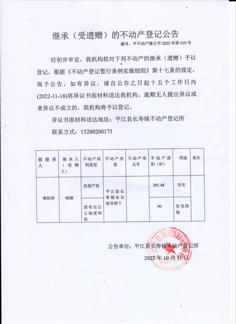 喻娜继承(受遗赠)的不动产登记公告