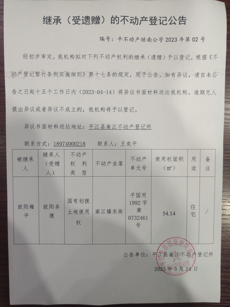 欧阳雍平继承(受遗赠)的不动产登记公告