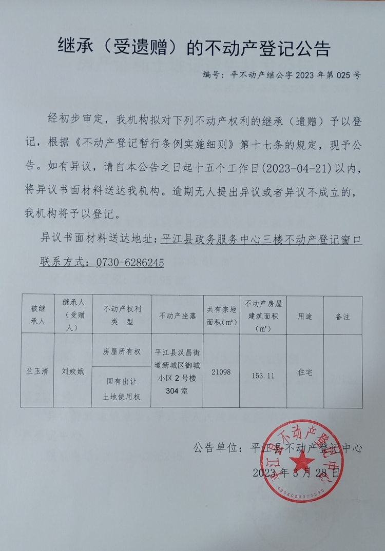 刘姣娥继承不动产登记公告