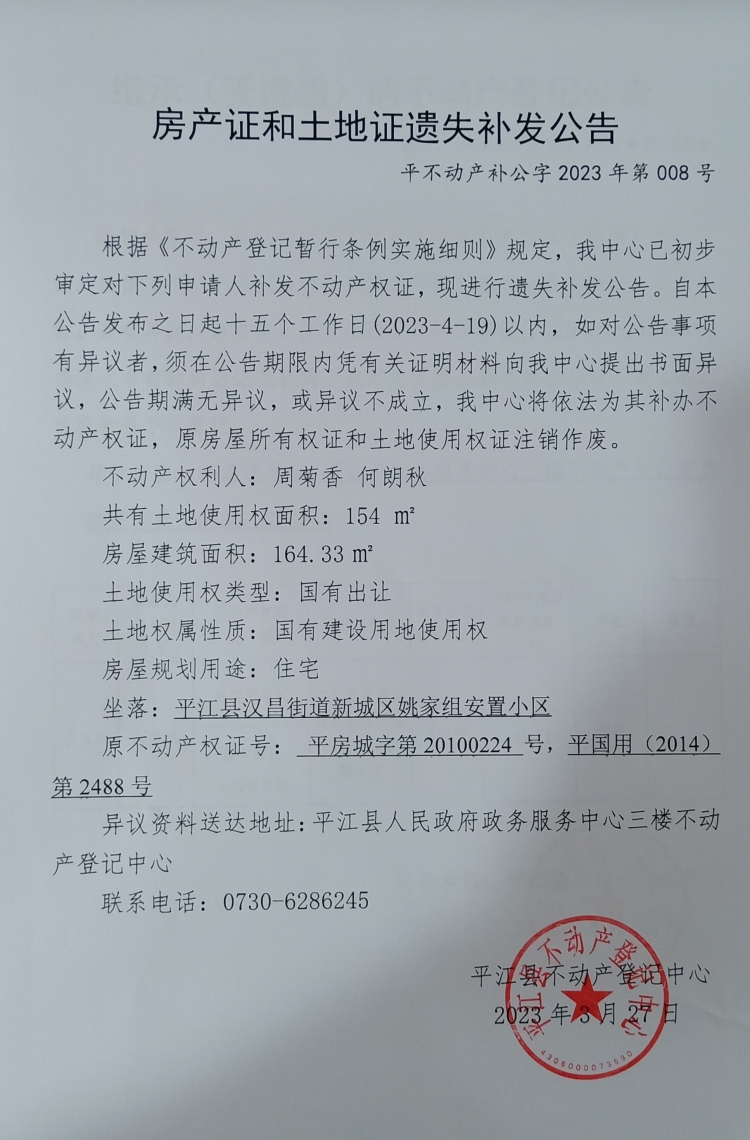 周菊香 何朗秋房产证和土地证遗失补发公告