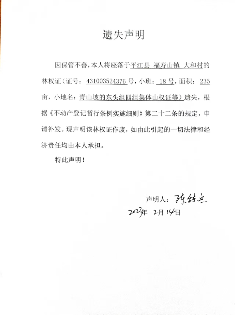 福寿山镇大和村东头组四组集体林权证遗失声明