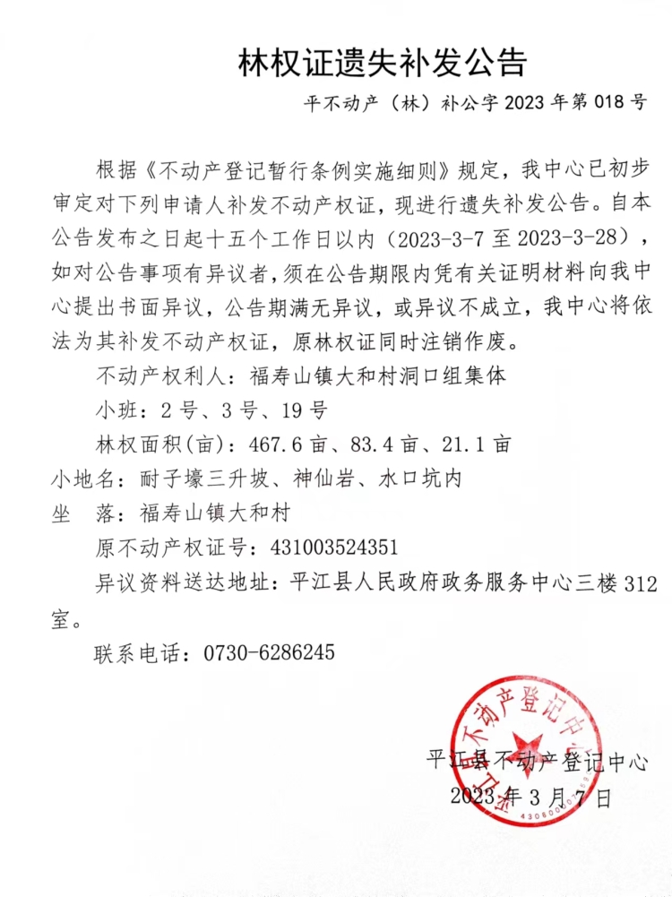 福寿山镇大和村洞口组集体林权证遗失补发公告