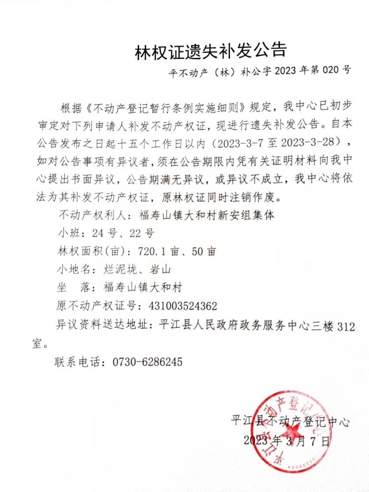 福寿山镇大和村新安组集体林权证遗失补发公告
