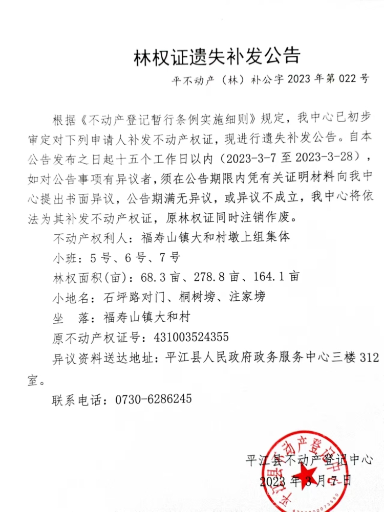 福寿山镇大和村墩上组集体林权证遗失补发公告