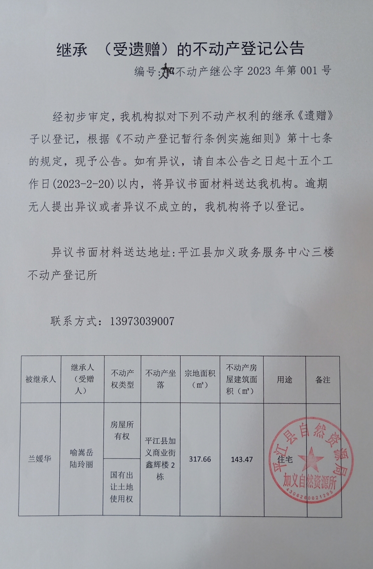 喻嵩岳继承(受遗赠)的不动产登记公告