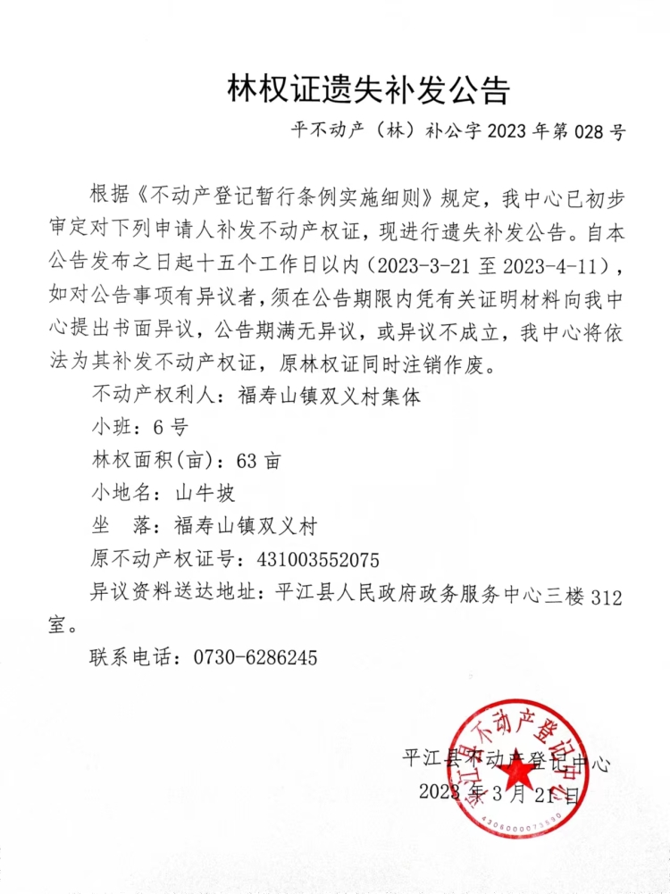 福寿山镇双义村集体林权证遗失补发公告