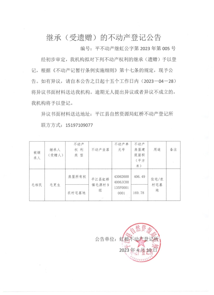 毛更兴不动产继承公告