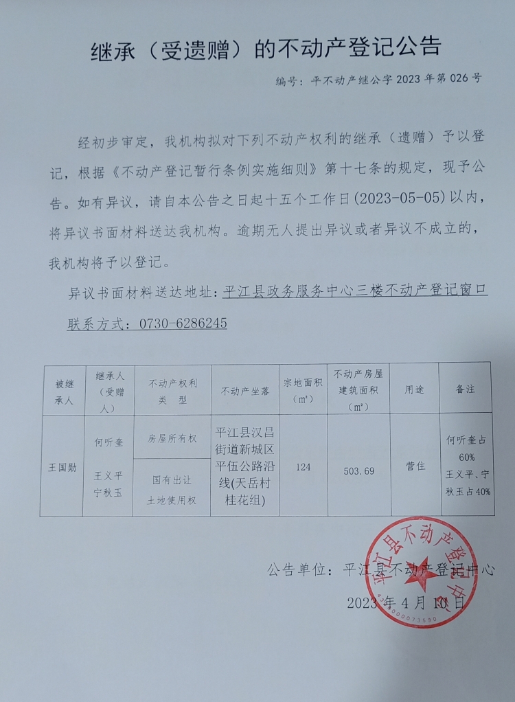 何听奎 王义平 宁秋玉继承不动产登记公告