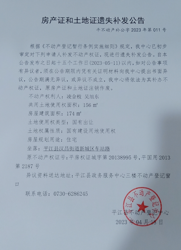 凌金枝 吴旭东房屋和土地证遗失补发公告