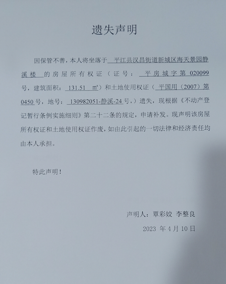 覃彩姣 李整良遗失补证声明