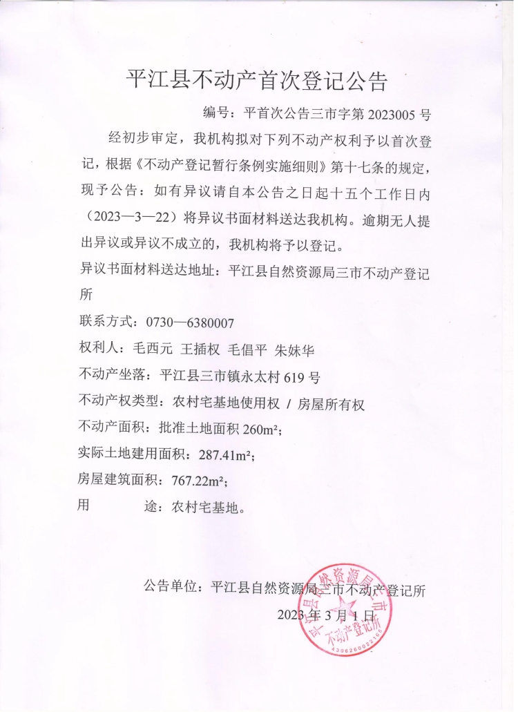 毛西元 王插权 毛倡平 朱妹华不动产首次登记公告
