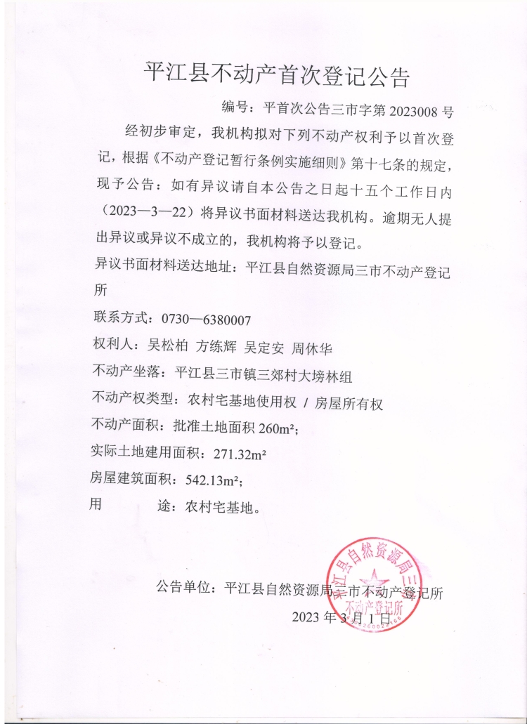 吴松柏 方练辉 吴定安 周休华不动产首次登记公告
