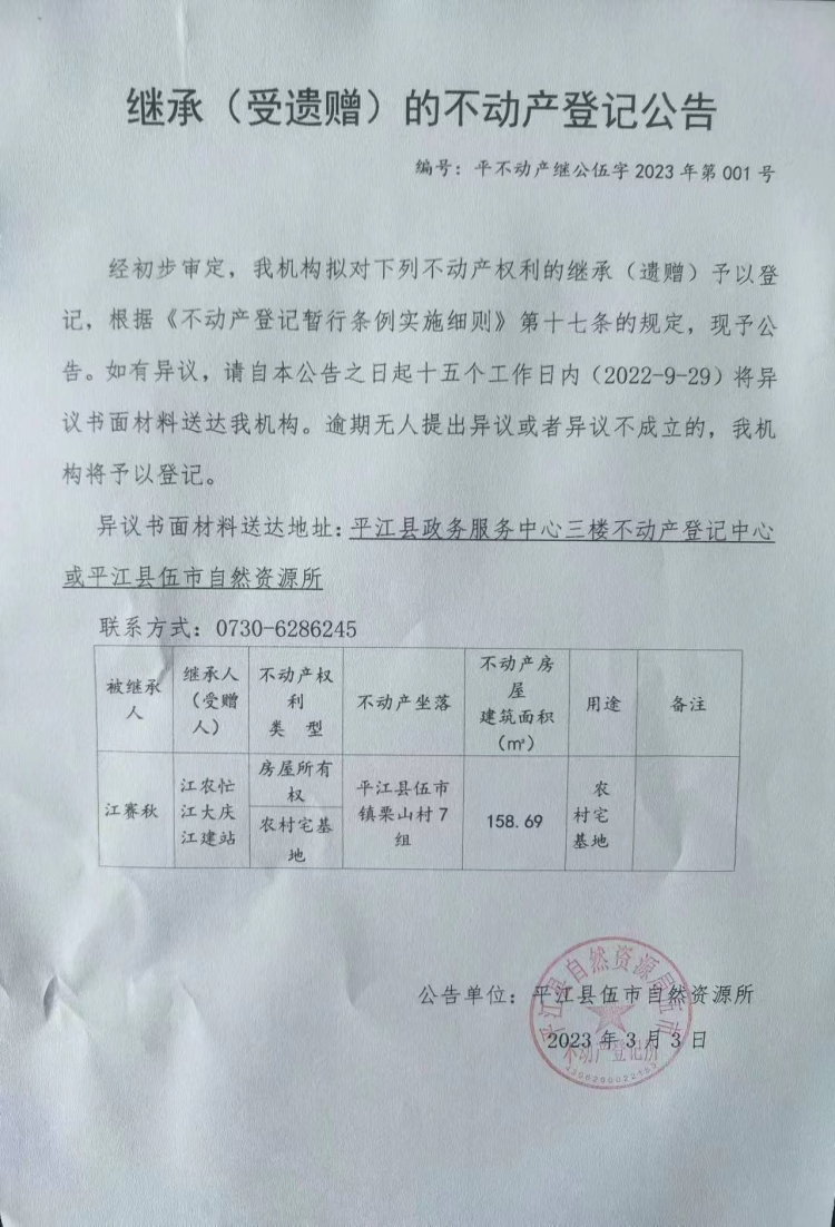 江农忙 江大庆 江建站继承农村宅基地不动产登记公告