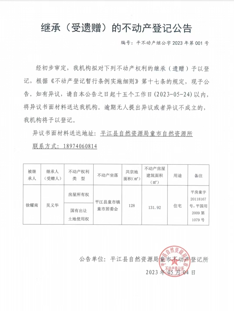 吴义华继承不动产登记公告