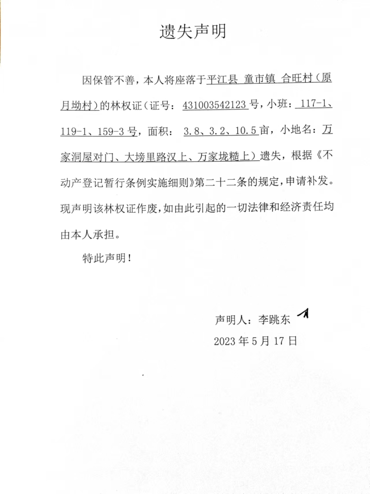 李跳东林权证遗失声明