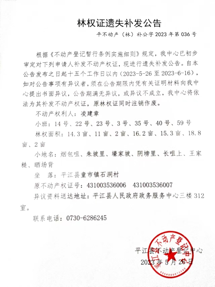 凌建章林权证遗失补发公告