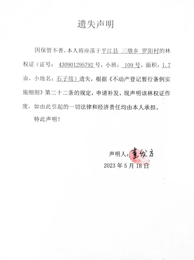 童发方林权证遗失声明