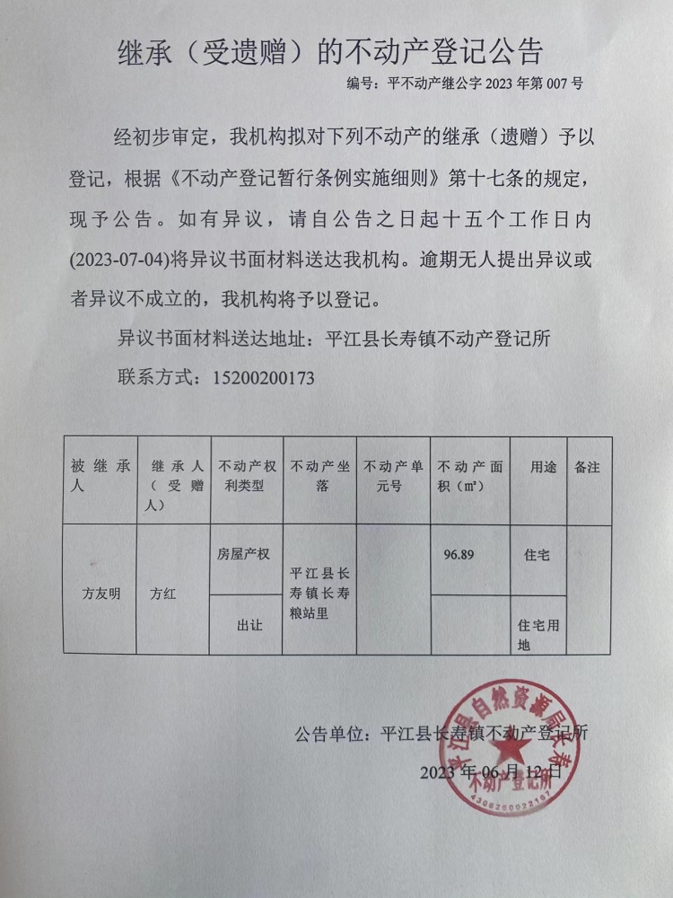 方红继承(受遗赠)的不动产登记公告