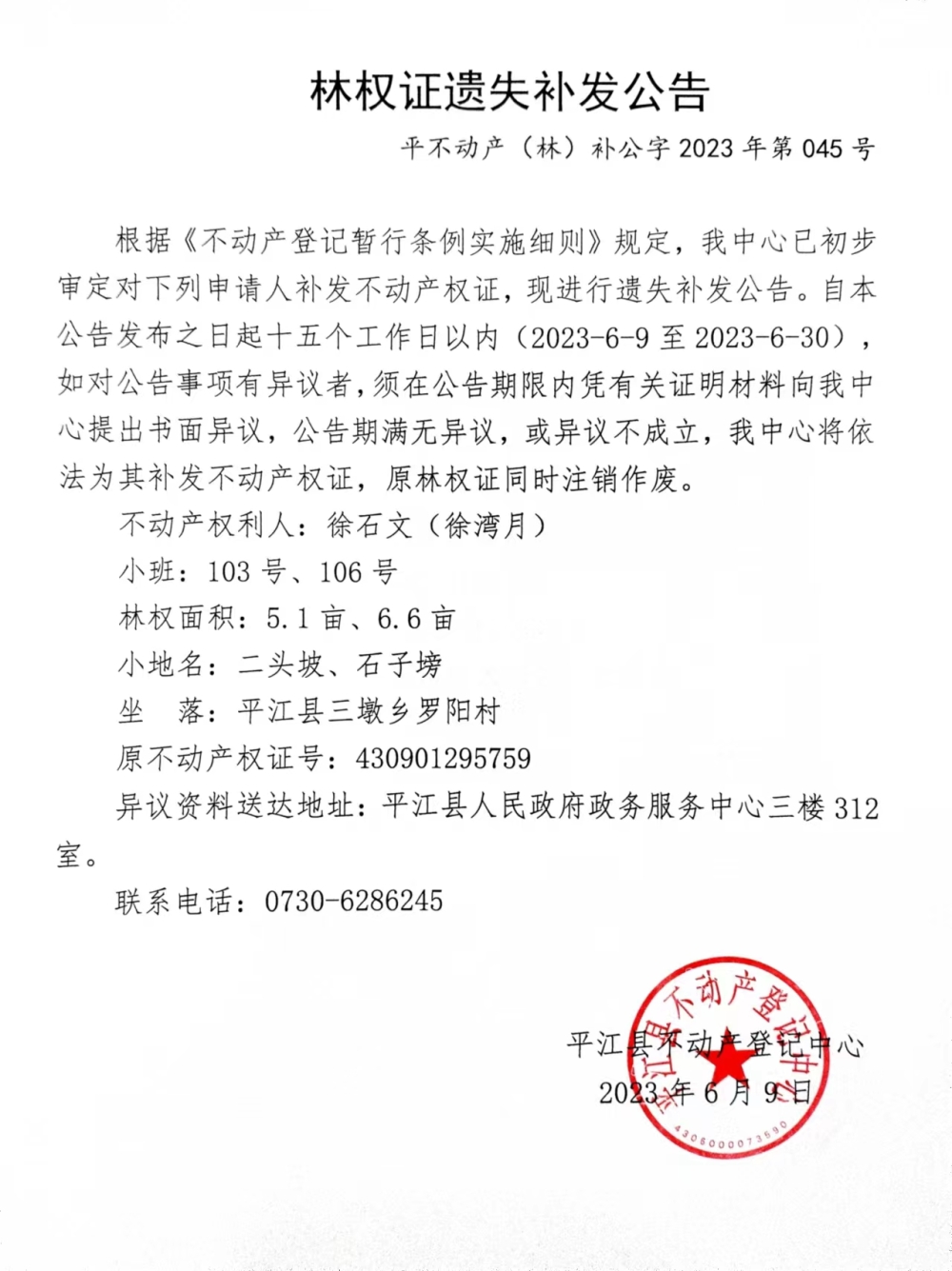 徐石文(徐湾月)林权证遗失补发公告